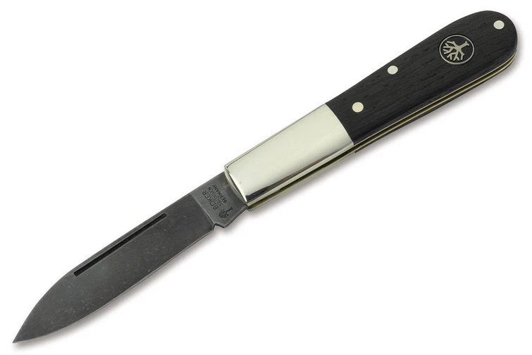 The classic Boker Barlow with its characteristic bolsters made of nickel silver is equipped here with a comparatively narrow blade made of non-stainless C75, which convinces with outstanding cutting durability and easy re-sharpening. The blade has a dark acid-wash finish, is opened with two hands by nail nick and does not lock. The high-quality handle scales are made of dark bog oak wood and thus form a beautiful contrast to the bolster. On the one hand, this handy pocket knife is a small companion that is absolutely suitable for the trouser pocket, but on the other hand it is also big enough to handle almost all cutting jobs in everyday life without any problems. Handmade in the Boker Knife Manufactory Solingen.