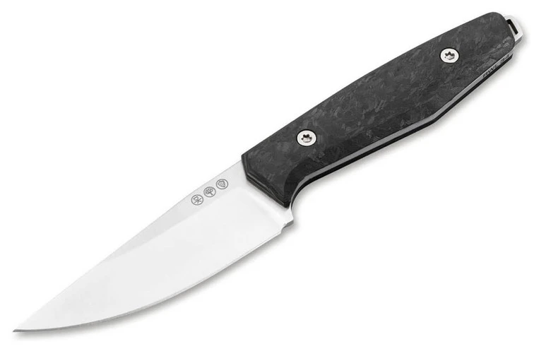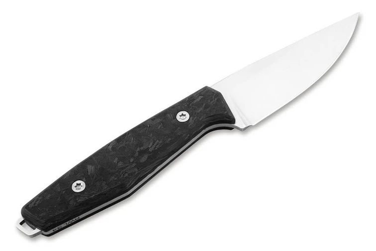 The ergonomically shaped handle scales are made of wild carbon fiber and are comfortable to hold. They can be easily dismantled using the torx-key supplied and can be replaced by a wide range of alternative scales developed and produced in conjunction with Daily Customs. In addition, the intricately manufactured lanyard hole at the end of the handle can be turned around when the handle scales are dismantled so that it disappears into the handle. It is made of RWL 34, just like the complete full tang, with minimal manufacturing tolerances. This means that the knife can be adapted to your own requirements in the shortest possible time and modified according to the situation.