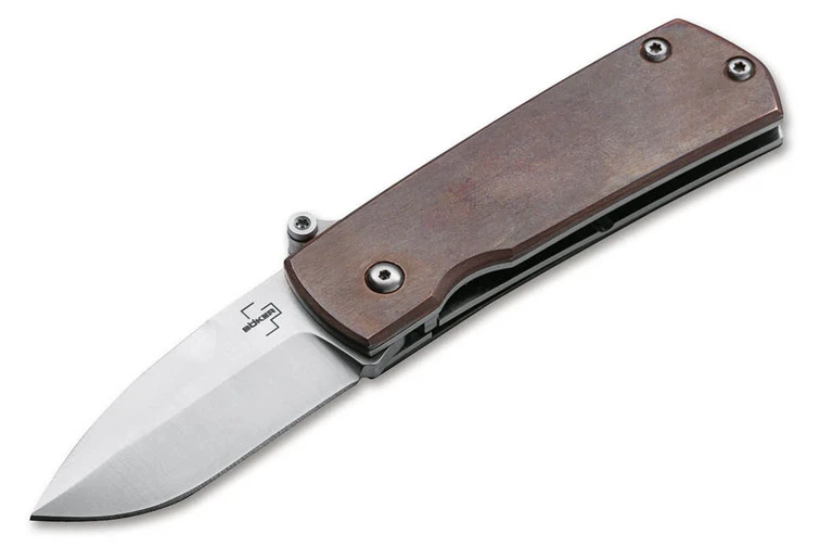 The satin-finished blade made of D2 is opened automatically by spring force when the trigger, reminiscent of a classic pinball machine, is pressed and is securely locked by a linerlock. The impressive flat handle scales are made of copper, so that a unique patina forms on them over time. With a small integrated lanyard hole and high-quality nylon case for storage.