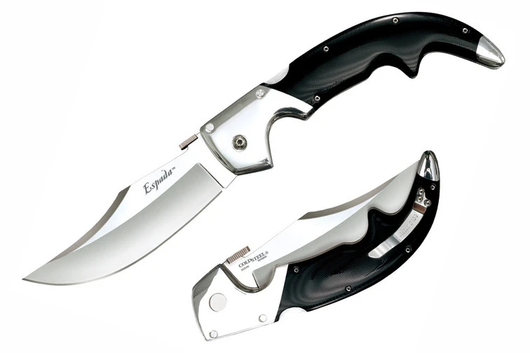 We have never been afraid to break with convention. That’s why, when everyone else in our industry made the smallest, flimsiest, dainty little knives that they could, we released a series of blades that could only be described as one thing – pocket swords!The Cold Steel Espada was inspired by the classical Navaja knives of Spain, but was utterly modern in both appearance and materials. These mega-folders took the market by storm! A design collaboration between custom knife maker Andrew Demko and Cold Steel President Lynn C. Thompson, our Espadas are available in two sizes to suit both the bold and the boldest of individuals! Despite their imposing size, our Espada are expertly designed to fit comfortably and discreetly in your pocket. You’ll soon forget that you are carrying such a large and impressive blade.Equipped with the patented Demko Thumb Plate, the Large and Extra Large Espadas can be snagged on your pocket, opening the knife as you draw it – and opening in the blink of an eye!The Espada’s beautiful blades are made from premium American S35VN Alloy Steel – chosen for its ability to not only take a super-fine cutting edge, but to hold it for an exceptionally long time.They also feature expertly polished G-10 scales and mirror polished 7075 Aluminum bolsters and frame. Each Espada is equipped with our patented Tri-Ad locking mechanism, proven to have amazing shock resistance and strength. In our own notoriously brutal product testing, the XL Espada was not only capable of holding 600lbs of free hanging weight, but we even used it to support a hanging engine block!