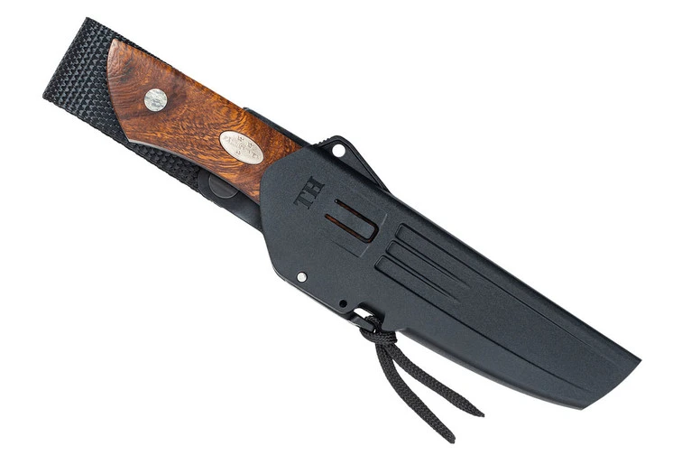 As shown in the design, TH1 is a handmade knife with a handle in the very exclusive desert ironwood (lat. Olneya tesota). This species is not listed in CITES Annexes or the IUCN Red List of Endangered Species and is therefore legal to use. Like all natural materials, it varies in texture and color, making each knife an individual creation. A beautifully veined pattern may look attractive but a straight, patterned handle is actually stronger. Desert ironwood, which grows in the southwestern United States, has a somewhat peculiar quality – it is heavier than water, its density is 1.2 kg/dm³ which means it will sink. If you want to maintain or even increase the luster in the wood, treat it with log oil, furniture oil, bench oil or other type of wood oil containing linseed oil. The fact that the blade goes full width through the handle (so-called full tang blade) results in a very strong and reliable construction and gives a comfortable weight to the knife.